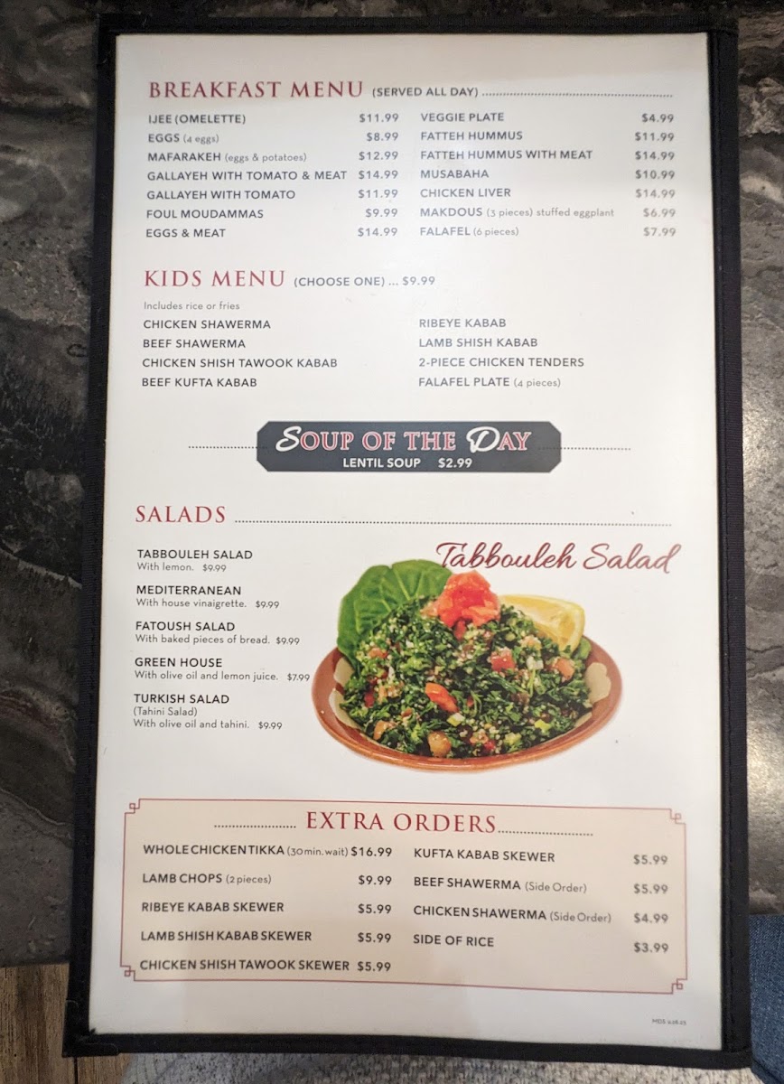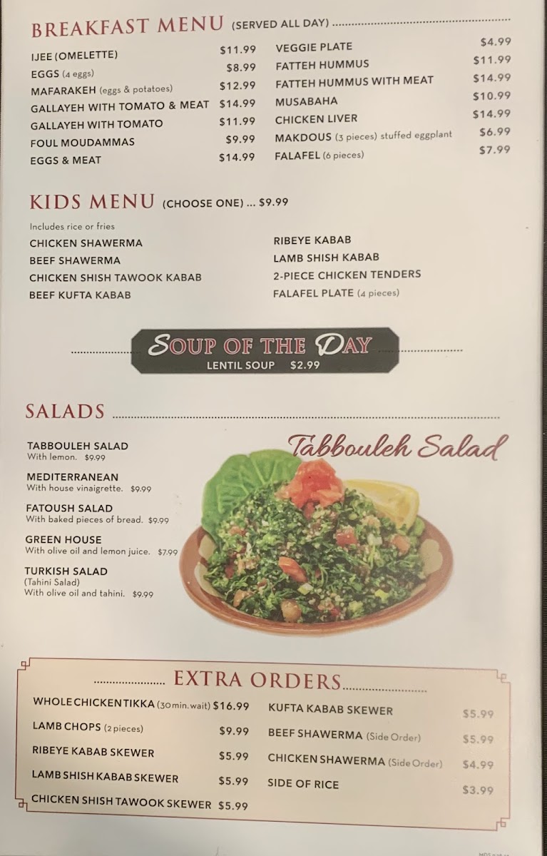 The early risers will appreciate the breakfast menu featuring a falafel omelette, providing a Mediterranean twist to your morning routine. For those in search of lighter options, the Tabouleh Salad presents a fresh and zesty choice, bursting with flavor and paired perfectly with your choice of dressing.